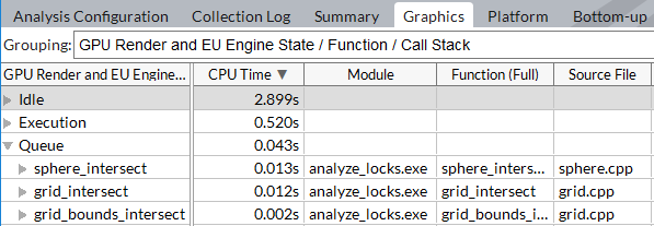 To understand the CPU activity (which module/function was executed and its CPU time) while the GPU execution units were idle, queued, or busy executing some code, use the GPU Render and EU Engine State grouping level: