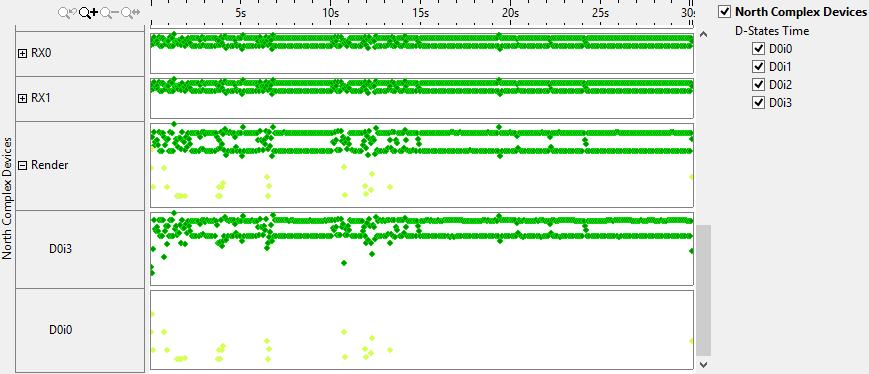 A device remaining in the active state (D0i0) can prevent the system from entering a deep sleep state (S0ix). Compare device time spent in the active state with System Sleep States or Graphics C/P State.