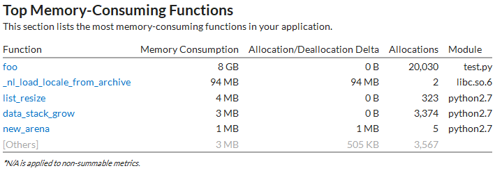 This section displays a list of top memory-consuming functions. For example, the foo function has the highest Memory Consumption metric value and could be a candidate for optimization: