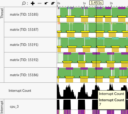 Open the Platform window to explore interrupts on the timeline view. The Interrupt Count chart provides a quick overview of the number of interrupts triggered during execution.