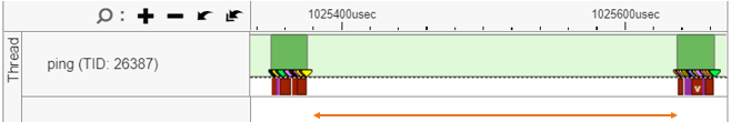 Locate a region with multiple context switches or high kernel activity and zoom in to investigate. For example, in this case the operating system has rescheduled a thread multiple times due to various reasons, including preemption and synchronization. Hover over the markers to get additional details and to determine the root cause of the issue.