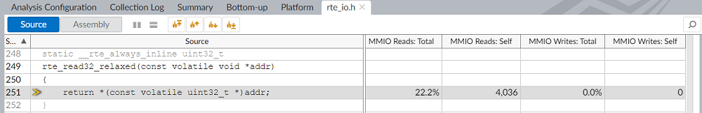 Double click on the function name to drive into source code or assembly view to locate the code responsible for MMIO reads and writes at source line level: