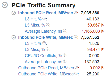 The Average Latency metric of the Inbound PCIe read/write groups shows an average amount of time the platform spends on processing inbound read/write requests for a single cache line.