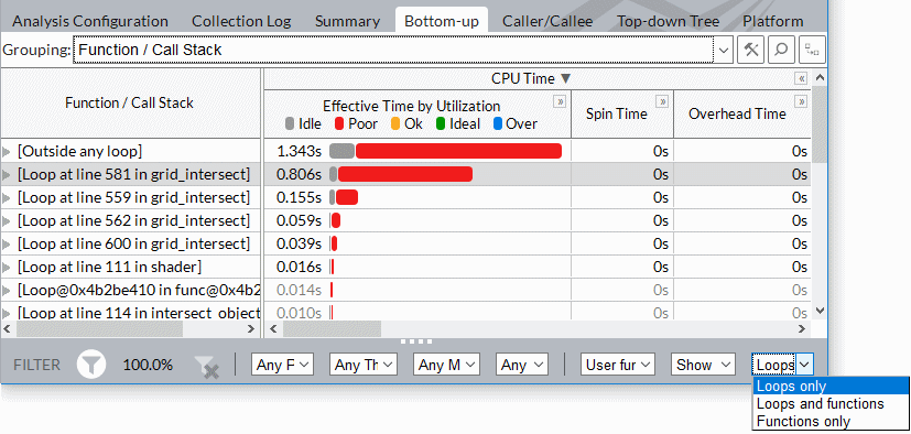 To identify the most time-consuming loop, select the Loops only mode in the Bottom-up window. By default, loops with the highest CPU Time values show up at the top of the grid.