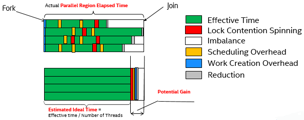 Overhead time is the time the system takes to deliver a shared resource from a releasing owner to an acquiring owner. Ideally, the Overhead time should be close to zero because it means the resource is not being wasted through idleness. However, not all CPU time in a parallel application may be spent on doing real payload work. In cases when a parallel runtime (for example, Intel® Threading Building Blocks, Intel® Cilk™, OpenMP*) is used inefficiently, a significant portion of time may be spent inside the parallel runtime wasting CPU time at high concurrency levels. For example, if you increase the number of threads performing some fixed load of work in parallel, each thread gets less work and the overhead, as a relative measure, will get larger. It is a basic application of Amdahl's Law.
