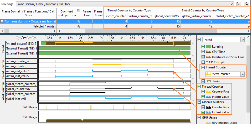 To view global counter values in the grid, make sure to select a generic (not thread specific) grouping level like Frame Domain/Frame/Function/Call Stack.