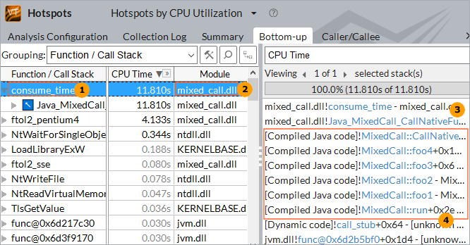 • For the Hotspots analysis type in the user-mode sampling mode, the VTune Profiler may display only a part of the call stack. To view the complete stack on Windows, use the -Xcomp additional command line JDK Java VM option that enables the JIT compilation for better quality of stack walking.
