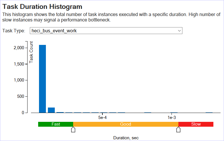If you collected data for Ftrace/Atrace tasks using the System Overview or a custom analysis with Ftrace/Atrace events selected, the Summary window also provides the Task Duration Histogram that helps you identify slow tasks: