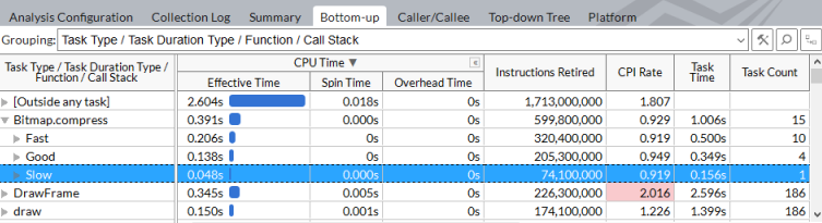 ITT API tasks: Analyze performance of particular code regions (tasks) if your target uses the Task API to mark task regions and you enabled the Analyze user tasks, events and counters option during the analysis type configuration