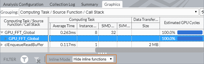 But if you select the Computing Task/Function/Call Stack or Computing Task/Source Function/Call Stack grouping level and enable the Inline Mode for this view, you see that the GPU_FFT_Global function took only 4.7% of the GPU Cycles, while four inline functions took the rest of cycles: