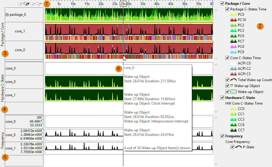 Package/Core C-states | Graphical representation of the sleep states in each core and in the overall package. Each state is a different color, which can be filtered using the legend. Hover over the band to view the total wake-up count. Click the |