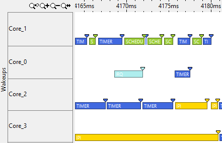 Unlike other traced event data, Wakeup and Abort events are displayed as bars and triangle event points on the timeline pane. Each event is color-coded by event type (timer, scheduled, etc.). The bar length shows how the event corresponds with the CPU sleep state, even though the event is instantaneous. The exact time of the wakeup or abort event is shown with the triangle.