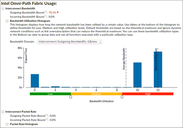 Outgoing and Incoming Bandwidth Bound metrics shows the percent of elapsed time that an application spent in communication closer to or reaching interconnect bandwidth limit.