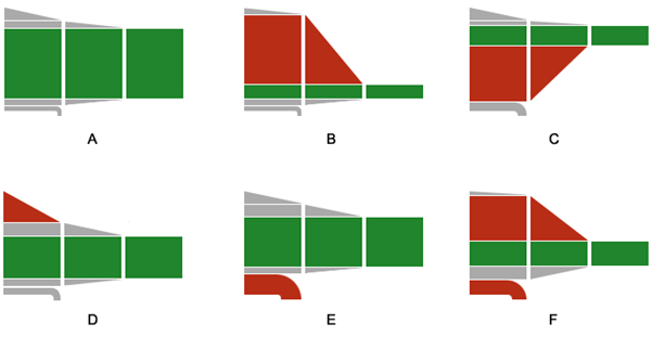 Red color signals a potential performance problem. A fraction of the green color in the diagram helps estimate how good execution efficiency is. So, the pipe form clearly represents existing CPU microarchitecture issues and enables you to recognize the following common patterns: