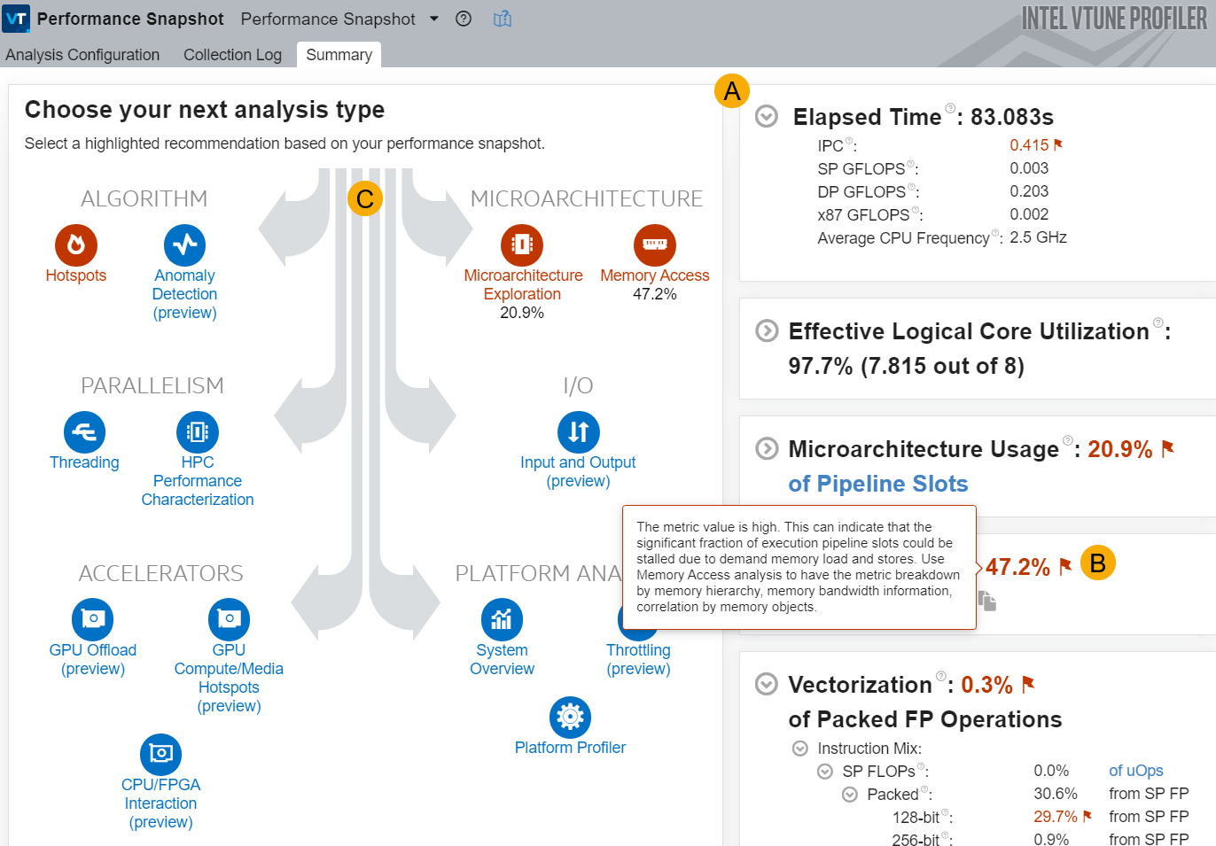 VTune Profiler provides several analysis types that are tailored to examine various application types and aspects of performance. Performance Snapshot captures a picture of these aspects and presents an overview of the workings of your application.