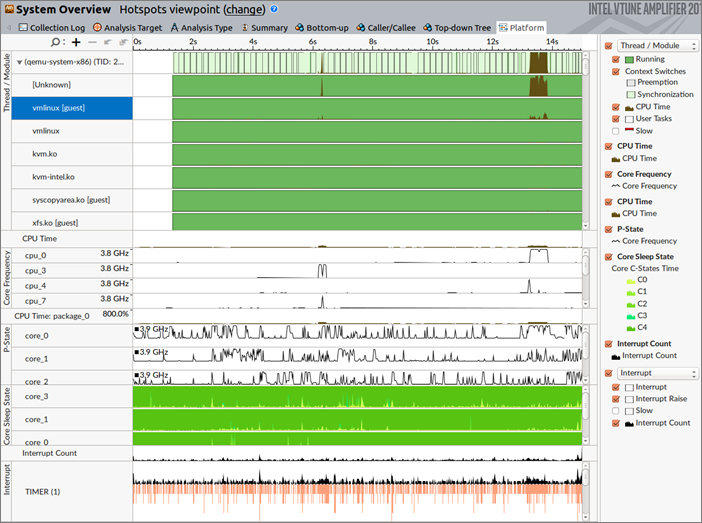 Focus on the Platform tab to analyze your code performance on the guest OS and correlate this data with CPU, GPU, power, hardware event metrics and interrupt count at each moment of time. If you enabled the kvm Ftrace event collection for your target, you can also monitor the statistics for KVM kernel module: