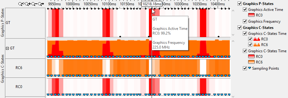 Time spent in each state is represented by a heat map. The heat map data may not be visible when viewing the full timeline. Zoom in on a section of interest to view the heat map and details about the data points. The heat map, represented in the example below with shades of red in the Graphics P-States timeline, illustrates how active the device was since the previous sample. The deeper the red color, the longer it was in the active state. The exact transitions between active and idle are not known. Hover over a point to view the percentage of time in the active state. In the example below, the device was active for 99.2% of the time between the two sampling points and the color is the deepest shade of red. The bars with lighter shades indicate less time in the active state.