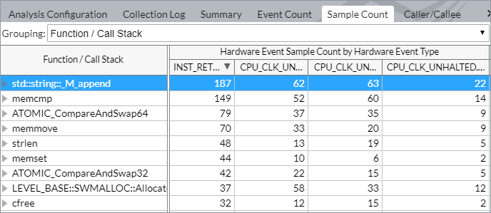 The Sample Count pane attributes the Hardware Event Sample Count by Hardware Event Type to program units. The Hardware Event Sample Count metric provides the actual number of samples collected for an event.