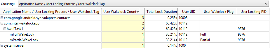 In the following example, two wakelocks originated from the com.intel.wakelockapp APK.