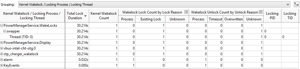 The Wakelock pane shows the list of wakelock objects for the user/application or kernel, depending on the grouping selected. Change the grouping selection to view data about either kernel or application/user wakelocks and the process that caused the lock or unlock. The following grouping levels and combinations of these grouping levels are available from the Grouping drop-down menu: