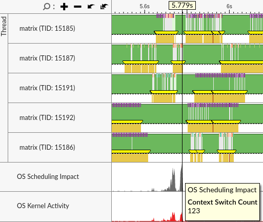Locate a region with multiple context switches or high kernel activity and zoom in to investigate. For example, in this case the operating system has rescheduled a thread multiple times due to various reasons, including preemption and synchronization. Hover over the markers to get additional details and to determine the root cause of the issue.