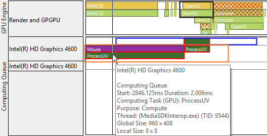 Computing Queue. Analyze details on OpenCL™ kernels submission, in particular distinguish the order of submission and execution, and identify the time spent in the queue, zoom in and explore the Computing Queue data. VTune Profiler displays kernels with the same name and global/local size in the same color. On Windows, synchronization tasks are marked with vertical hatching You can click a kernel task to highlight the whole queue to the execution displayed at the top layer. Hover over an object in the queue to see kernel execution parameters. ![]() Windows only: ![]() On Windows, you can explore how the execution path (marked in blue) of the OpenCL device queue (in orange) correlates with the DMA packets software queue (in black). The OpenCL kernel queue expedites kernels to the driver where DMA packets of different types are get multiplexed in the single DMA queue. In the example above, the Render and GPGPU queue serves both graphics (GHAL3D) and compute (OpenCL)-originated packets. |
