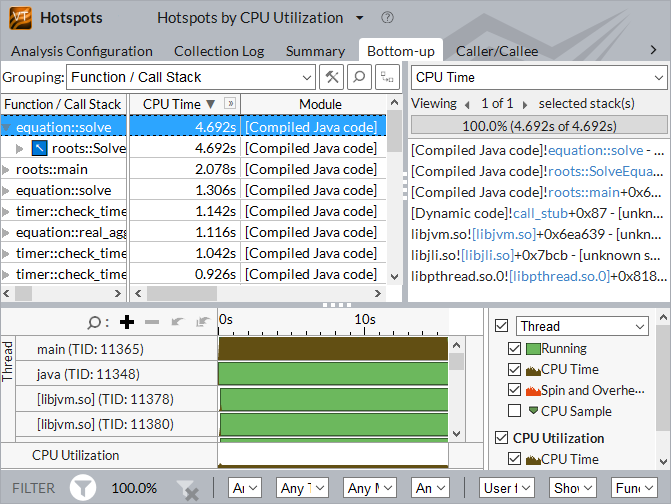 For the Hotspots analysis type in the user-mode sampling mode, the VTune Profiler may display only a part of the call stack. To view the complete stack on Windows, use the -Xcomp additional command line JDK Java VM option that enables the JIT compilation for better quality of stack walking.