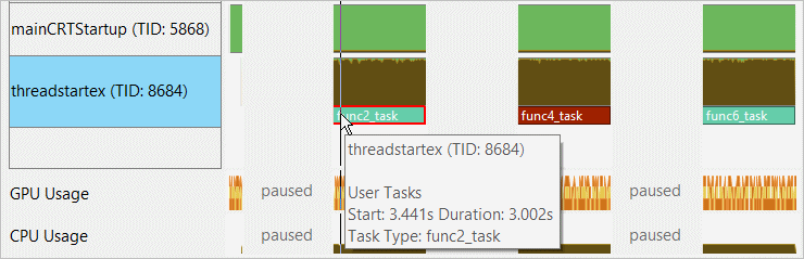 User tasks are shown on the timeline with yellow markers. Hover over a task marker for task execution details. In the example above, the func2_task started at the 3.4th second of the application execution on the thread threadstartex (TID: 8684) and lasted for 3.002 seconds.