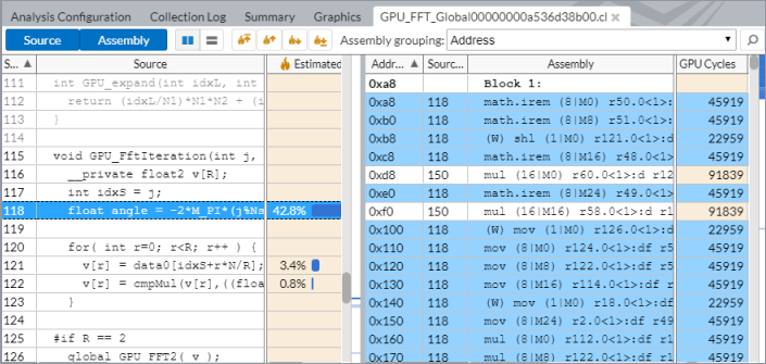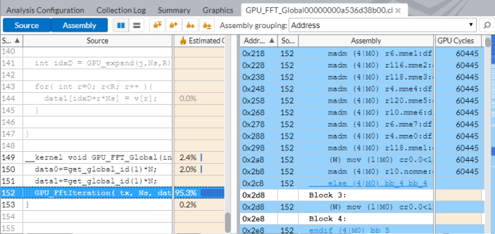 Double-click the hottest GPU_FftIteration function to analyze its source and assembly code: