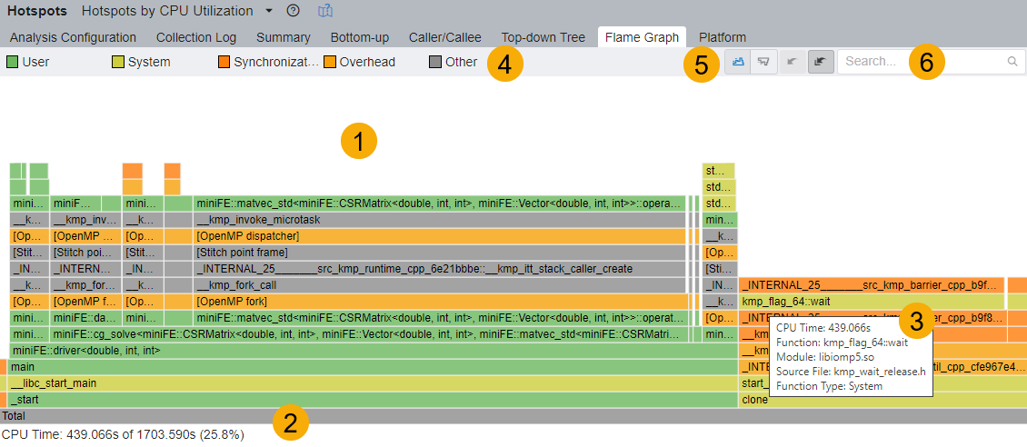 - Pay close attention to the hottest user and synchronization functions. In the flame graph, they appear as the widest functions.
