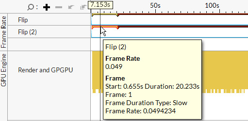 Hover over a frame object to view a summary including data on frame duration, frame rate, and others: ![]() CPU and GPU frames with the same ID are displayed in the same color. |