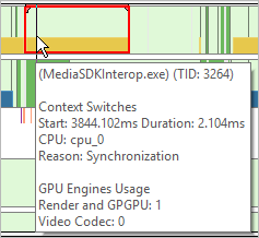 Thread. Explore CPU utilization by thread. The Platform window displays the thread name as a name of the module where the thread function resides. For example, if you have a myFoo function that belongs to MyMegaFoo function, the thread name is displayed as MyMegaFoo. This approach helps easily identify the location of the thread code producing the work displayed on the timeline. If your code used the Task API to mark the tasks regions or you enabled any system tasks for monitoring specific events, the task objects show up on the timeline and you can hover over such an object for details: ![]() Windows only: Hover over a context switch area to see the details on its duration, reason, and affected CPU. Dark-green context switches show time slices when a thread was busy with a workload while light-green context switch objects show areas where a thread was waiting for a synchronization object. Gray areas show inactivity periods caused by preemption when the operating system task scheduler switched a thread off a processor to run another, higher-priority thread. ![]() Correlate CPU and GPU utilization and estimate whether your application is CPU or GPU bound. GPU Engines utilization bars show DMA packets on CPU threads originating GPU tasks. The bars are colored according to the type of used GPU engine (yellow bars in the example below correspond to the Render and GPGPU engine). If the GPU Engine area of the Platform window shows aggregated GPU utilization for all threads and processes in the system, the GPU Engines Utilization bars in the Thread area show GPU engine utilization by a particular thread. |
