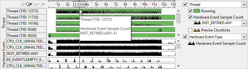 The Timeline pane is synchronized with the Sample Count pane. The Thread area of the Timeline pane shows the number of samples collected for the selected event (INST_RETIRED.ANY in the example below) while a thread was running. You may use the Hardware Event Sample Count drop-down menu in the legend area to choose a different event.