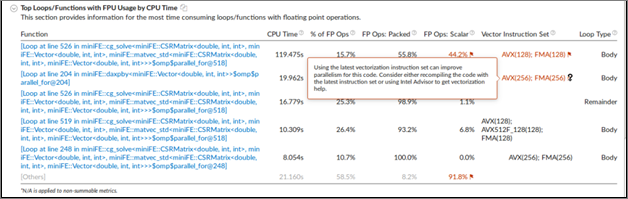 The Top Loops/Functions with FPU Usage by CPU Time table shows the top functions that contain floating point operations sorted by CPU time and allows for a quick estimate of the fraction of vectorized code, the vector instruction set used in the loop/function, and the loop type.