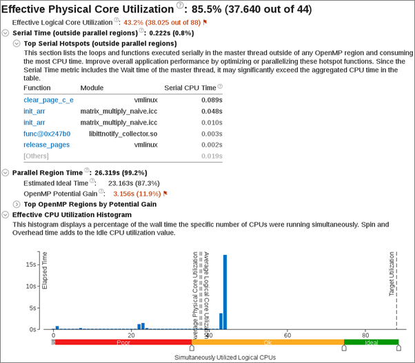 OpenMP Analysis Collection Time: Displays metrics for the duration of serial (outside of any parallel region) and parallel portions of the program. If the Serial time is significant, review the Top Serial Hotspots section and consider options to minimize serial execution, either by introducing more parallelism or by doing algorithm or microarchitecture tuning for sections that seem unavoidably serial. For high thread-count machines, serial sections have a severe negative impact on potential scaling (Amdahl's Law) and should be minimized as much as possible.