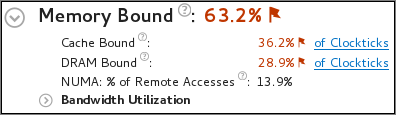 A high Memory Bound value might indicate that a significant portion of execution time was lost while fetching data. The section shows a fraction of cycles that were lost in stalls being served in different cache hierarchy levels (L1, L2, L3) or fetching data from DRAM. For last level cache misses that lead to DRAM, it is important to distinguish if the stalls were because of a memory bandwidth limit since they can require specific optimization techniques when compared to latency bound stalls. VTune Profiler shows a hint about identifying this issue in the DRAM Bound metric issue description. This section also offers the percentage of accesses to a remote socket compared to a local socket to see if memory stalls can be connected with NUMA issues.