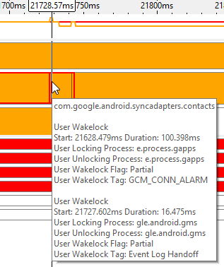 Wakelock Details | Hover over the timeline of an application to view tooltips with details such as the wakelock type, start time, duration, locking and unlocking process name, and application name. Hover over the timeline of a kernel wakelock to view tooltips with details such as the wakelock type, start time, duration, locking and unlocking reasons, and locking process. Zoom in on the timeline to view the exact time when the wakelock started and when it was released. It is possible for one wakelock to begin before another ends, causing an overlap.
