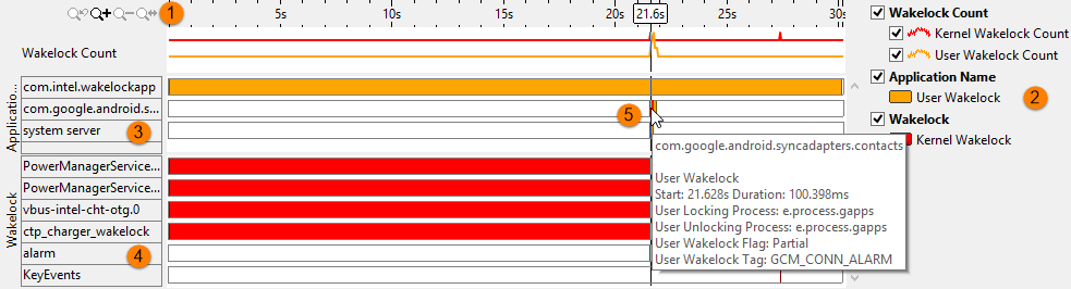 Legend | Types of data presented on the timeline. Filter in/out any type of data presented on the timeline by selecting/deselecting corresponding check boxes. For example, you may only be interested in the application/user wakelock data and want to remove the kernel wakelock timelines for an expanded view of the application/user wakelock data. |