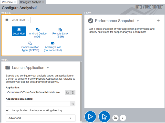When you create a project, the Configure Analysis window opens pre-configured to run Performance Snapshot on the local host. Click on the analysis name in the WHERE pane to open the Analysis Tree, where you can choose a different analysis type.