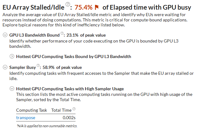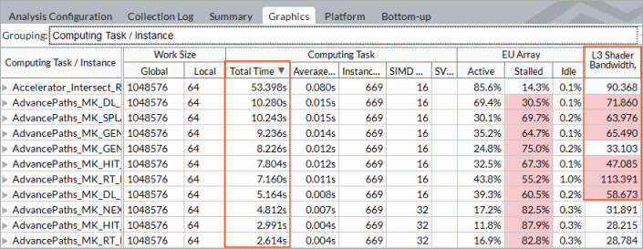 The corresponding columns show the overall time a kernel ran on the GPU and the average time for a single invocation (corresponding to one call of clEnqueueNDRangeKernel ), working group sizes, as well as averaged GPU hardware metrics collected for a kernel. Hover over a metric column header to read the metric description. If a metric value for a computing task exceeds a threshold set up by Intel architects for the metric, this value is highlighted in pink, which signals a performance issue. Hover over such a value to read the issue description.