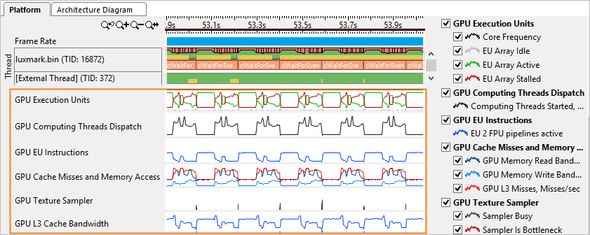 If you know that your application uses OpenCL software technology and the GPU Computing Threads Dispatch metric in the Timeline pane of the Graphics window confirms that your application is doing substantial computation work on the GPU, you may continue your analysis and capture the timing (and other information) of OpenCL kernels running on Intel Graphics. To run this analysis, enable the Trace GPU Programming APIs option during analysis configuration. The GPU Compute/Media Hotspots analysis enables this option by default.