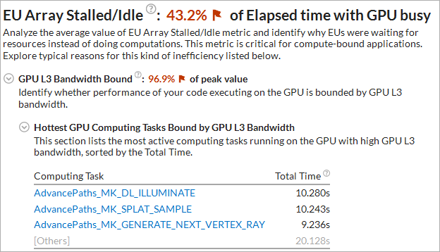 Depending on the GPU hardware events preset you used during the analysis configuration, the VTune Profiler explores potential reasons for stalled/idle GPU execution units and provides them in the Summary. For example, for the Compute Basic preset, you may analyze GPU L3 Bandwidth Bound issues:
