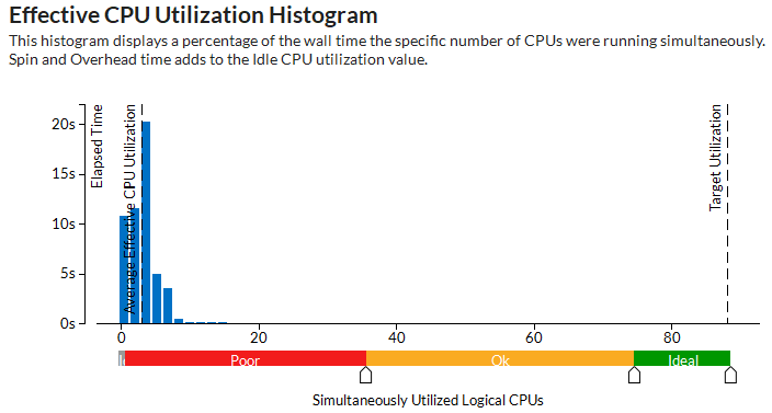 Start exploration of oneTBB parallelization efficiency with Hotspots. Look at the Effective CPU Utilization Histogram to see the parallelization level of your application. Note that the histogram reflects the parallelization levels of your application based on the effective time spent subtracting time spent in threading runtimes.