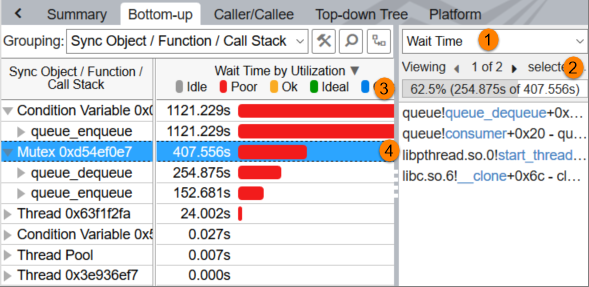 Contribution bar. Analyze the indicator of the contribution of the currently visible stack to the overall metric data for the selected program unit(s). If you select a single stack in the result window, the Contribution bar shows 100%. If more than one program unit is selected, all the related stacks are added to the calculation. In the example above, the function selected in the Bottom-up grid had 3 Wait Time stacks leading to it with the total Wait time 23.718 seconds. The first stack is responsible for 97.9% (or 23.230s) of the overall 23.718 seconds. Note that the Bottom-up grid aggregates all 3 stacks into one since all of them go to the same function in different code lines. |