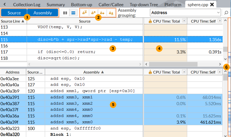 Source/Assembly toggle buttons. By default, depending on the symbol information availability, the VTune Profiler opens one of the panes: Source or Assembly. But you can use the toggle Source and Assembly buttons on the toolbar to manage the view and enable both of them if required/possible. The content displayed on the Source and Assembly panes is correlated. When you select an element on one pane, another pane scrolls to the corresponding elements and highlights them.