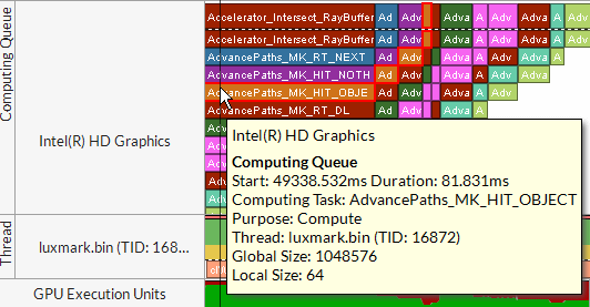 Computing Queue. Analyze details on OpenCL™ kernels submission, in particular distinguish the order of submission and execution, and identify the time spent in the queue, zoom in and explore the Computing Queue data. Intel® VTune™ Profiler displays kernels with the same name and global/local size in the same color. On Windows, synchronization tasks are marked with vertical hatching You can click a kernel task to highlight the whole queue to the execution displayed at the top layer. Hover over an object in the queue to see kernel execution parameters. ![]() Windows only: ![]() On Windows, you can explore how the execution path (marked in blue) of the OpenCL device queue (in orange) correlates with the DMA packets software queue (in black). The OpenCL kernel queue expedites kernels to the driver where DMA packets of different types are get multiplexed in the single DMA queue. In the example above, the Render and GPGPU queue serves both graphics (GHAL3D) and compute (OpenCL)-originated packets. |