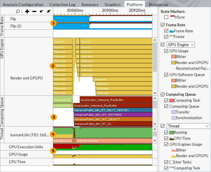GPU Engine. Explore overall GPU utilization per GPU engine at each moment of time. By default, the Platform window displays GPU Utilization and software queues per GPU engine. Hover over an object executed on the GPU (in yellow) to view a short summary on GPU utilization, where GPU Utilization is the time when a GPU engine was executing a workload. You can explore the top GPU Utilization band in the chart to estimate the percentage of GPU engine utilization (yellow areas vs. white spaces) and options to submit additional work to the hardware. To view and analyze GPU software queues, select an object (packet) in the queue and the Intel® VTune™ Profiler highlights the corresponding software queue bounds: ![]() Full software queue prevents packet submissions and causes waits on a CPU side in the user-mode driver until there is space in the queue. To check whether such a stall decreases your performance, you may decrease a workload on the hardware and switch to the Graphics window to see if there are less waits on the CPU in threads that spawn packets. Another option could be to additionally load the queue by tasks and see whether the queue length increases. Each packet in the Platform window has its own ID that helps track its life cycle in a software queue. The ID does not correspond to the rendered frames. You may identify where a packet came from by the thread name (corresponding to the name of the module where a thread entry point resides) specified in the tooltip. Horizontal hatching is used for data that may be not accurate due to collection issues (for example, missing event from the Intel® Graphics Driver). This type of data is identified as Reconstructed packets in the Legend. Windows only: For Windows targets, you may select the Packet Type drop-down menu option in the Legend area to explore GPU utilization and software queues per DMA packet domain: ![]() Presents on Windows targets are displayed in a red hatch. |