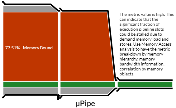 The first section displays the summary statistics on the overall application execution per hardware-related metrics measured in Pipeline Slots or Clockticks. Metrics are organized by execution categories in a list and also represented as a µPipe diagram. To view a metric description, mouse over the help icon