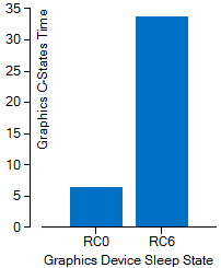 Graphical representation of the amount of time spent in each GPU sleep state (C-State). Hover over a bar to see the number of seconds your application executed in a specific sleep state. Switch to the Graphics C/P States sub-tab to view more detailed information about the time spent in each state, including graphics frequency changes over time. See Window: Graphics C\P States - Platform Power Analysis for more information.