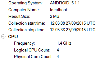 Provides basic details about the data collected (result size) and the device on which it was collected (operating system, CPU count, core count).